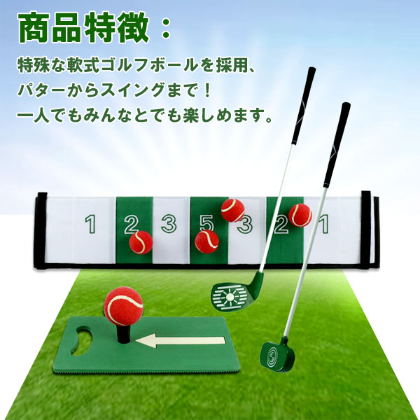| 商品内訳 | 商品素材:ファイバーグラス、プラスチックなど 商品重量:約7kg セット内容: 丸形標的 三角型標的 旗竿標的 スイングクラブ パター マット(tee含む) 軟式ボール |